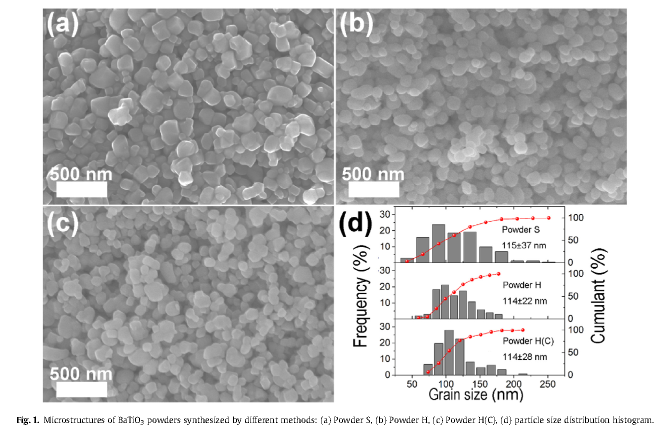 일반적으로 나노세라믹파우더를 합성하는 연구가 많이 수행되었는데, 이 중 고상법과 수열법이 유망하고 대량생산에 적합하다. 나노 세라믹 분말을 합성하는 방법이 최종 소결체의 유전성, 특히 초미세 입자 크기를 갖는 소결체에 큰 영향을 미친다는 것은 말할 나위가 없다. 윤 등의 연구진은 수열 BaTiO3 분말이 DT-TGA 측정에서 더 큰 질량 손실을 보였으며, 이는 양성자, 하이드록실 이온, 탄산 이온과 같은 결함의 방출에 기인한다고 보고했다. 많은 결함이 수열 공정의 고압 하에서 용해-재침전 반응을 거쳐 BaTiO3 격자에 통합되었다. 열처리를 할 때 물과 함께 결함이 방출되나, 나노미터 크기의 작은 intergranula 기공이 남아서 모이게 되어 소결 과정 중에 이동하게 된다. 또한, 이러한 기공은 분말 밀도를 낮추고 perovskite unit cell의 정방정 변형을 억제합니다. Hennings 등은 MLCC의 소결 최종 단계에서 비정상적인 "bloating" 현상을 관찰하였으며여, 이것이 MLCC의 균열 또는 전극 delamination 현상을 유발한다고 했습니다. 이에 비해 결정화도가 높은 고상 분말에서는 이러한 비정상적인 "bloating"이 거의 관찰되지 않습니다.