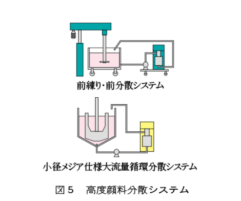 비즈밀을 이용해 고도의 안료 분산을 효율적으로 실시하기 위해서는, 전술한 것처럼 대유량 순환 분산 방식에 의해 체류 시간 분포를 샤프하게 하거나 φ1.0 mm 미디어에 의한 사전분산, φ0.1 mm 미디어에 의한 미세 분산의 이단 분산하는 것이 필요하다. 이번에 개발한 고도 안료 분산 시스템은 전분산용 대유량 순환 분산형 비즈밀, φ0.1mm 미디어를 사용한 미세 분산용 대유량 순환 분산형 비즈밀 및 순환조용 교반기로 구성되며, 그림 5와 같다.