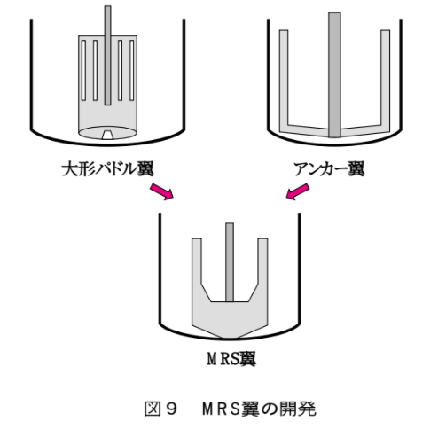 도료의 밀 베이스에는 안료 분산도가 진행됨에 따라 구조 점성이 높아지는 것이 많기 때문에 순환조의 교반에서는 순환조 벽면 근방에 구조 점성에 의한 정류부가 생기지 않는 구조를 필요로 한다.앵커날개는 탱크벽면의 유동을 촉진하기 위한 날개이나 날개 안쪽은 날개와 함께 회전할 뿐 혼합성능은 매우 나쁘다.한편 대형 패들날개는 날개 하부의 패들에 의해 발생하는 강력한 상하방향 순환류에 의해 혼합성능은 뛰어나지만 구조 점성이 큰 경우에는 앵커날개에 비해 수조벽에서의 유동이 나빠진다.나아가순환조는조상부에서액이들어와하부에서배출되는유통계이기때문에대형패들날개의강력한상하순환류는단락의원인이된다.MRS날개는 앵커날개와 대형 패들날개의 특징을 살린 교반날개로, 구조 점성이 높은 밀베이스에서도 조 벽면에 정류부를 생기지 않는 것 및 상하 순환류를 억제하여 순환조에서 단락이 없는 것이 특징이다.구조가 간단하고 세정성이 우수함.이미 실라인에서 순환조용 교반익으로서 많은 실적이 있다.