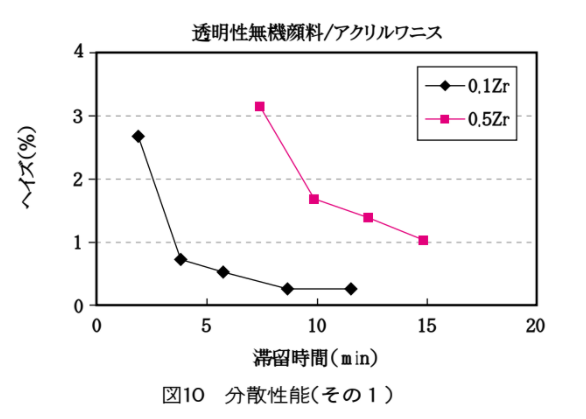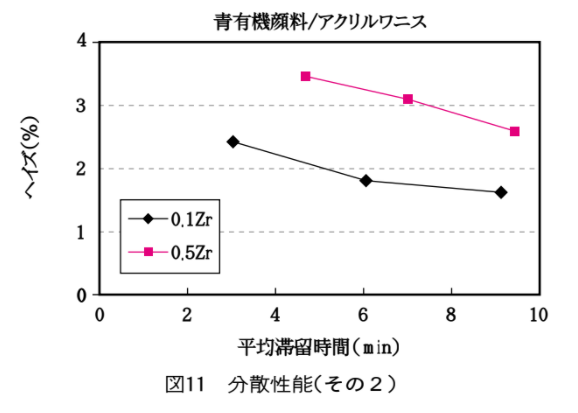 분산 레벨의 평가는 도막의 헤이즈값 측정으로 실시했다. 헤이스치가 낮을수록 안료 입자에 의한 광산란이 적어 미세하게 분산돼 있음을 보여준다. 두 축 모두 원심분리식 비즈 밀에 의해 φ0.1mm 메디아로 분산된 것은 짧은 밀 체류시간에 헤이즈가 낮아져 몇 배의 분산속도를 가지고 있다는 것 및 고도로 분산이 진행되고 있다는 것을 알 수 있다(그림10, 11, 12). 또한 동일한 수준의 분산도를 얻는데 소요되는 분산 에너지는 φ0.5mm 지르코니아 미디어를 사용한 경우에 비해 수분의 일로 저감되어 있었다.