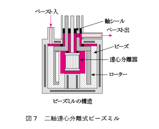도료의 안료 페이스트는 고점도계가 많기 때문에 φ0.1 mm의 지르코니아 미디어를 사용하여 대유량 순환 분산하기 위해서는 강력한 원심력으로 메디아와 페이스트의 분리를 실시할 필요가 있다. 전술한 Anular형 로터와 스크린을 조합한 다이내믹 세퍼레이션 방식으로는 곤란하며, 그래서 개발한 것이 그림 7에 나타낸 2축 원심분리기구를 갖춘 비즈밀이다. Anular형 로터와 원심분리기는 동심 두 축이며 각각 독립적으로 회전할 수 있다. 원심분리기로 미디어와 분리된 페이스트는 중공 로터축 안쪽을 지나 상부에 설치된 구멍에서 배출된다.