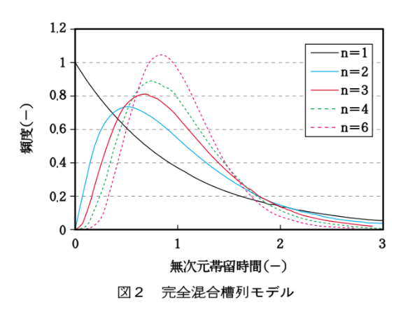 체류시간 분포를 나타내려면 완전 혼합조열 모델과 확산 모델이 있는데, 각 분산 시스템에서의 체류 시간 분포를 계산할 경우, 확산 모델을 이용하면 복잡하며, 여기에서는 완전 혼합조열 모델에 대해 기술한다. 완전혼합조열 모델에서는 조내는 균일하게 혼합되어 있어 조로부터 유출되는 유체 중의 농도는 조내의 농도와 동일하다고 하고, 체류시간 분포를 완전혼합조의 열수 n으로 나타낸다. 완전혼합조 n열의 체류시간분포 Fn(θ)은 다음 식으로 나타낼 수 있다.