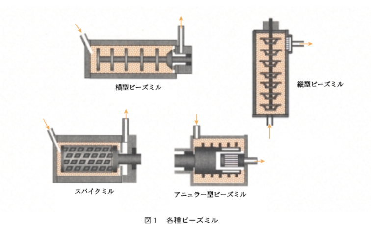 그림 1에 대표적인 비즈밀을 도시하고 있다.그 중에서 로터 회전에 의해 스크린 상에 발생하는 원심력을 이용하여 밀 베이스와 메디아를 분리하는 다이내믹 세퍼레이션 기구를 갖춘 Anular형 비즈 밀의 등장으로 미세 미디어를 이용한 대유량 순환 분산이 가능해져 비즈 밀의 분산 수준이 비약적으로 향상되었음이 특기된다.