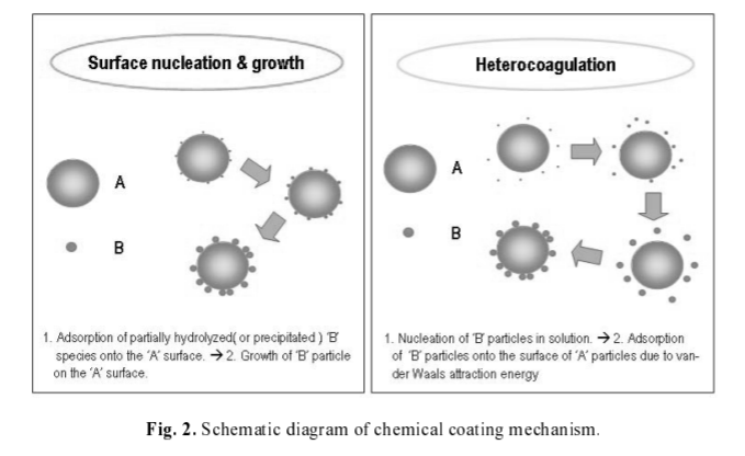 Chemical coating process의 반응과정에서 일어날 수 있는 coating mechanism은 일반적으로 surface nucleation과 heterocoagulation process로 나눌 수 있다. Surface nucleation 반응 은 core particle 표면에 국부적으로 hydrolyzed된 물질이 흡착 (침전)되어 성장하는 process이며, hetero-coagulation mechanism은 solution내에 핵 생성된 shell particle(coating 하려는 물질)이 core particle과의 강한 attraction energy에 의 해 core particle 표면에 흡착하는 mechanism이라고 할 수 있 다.