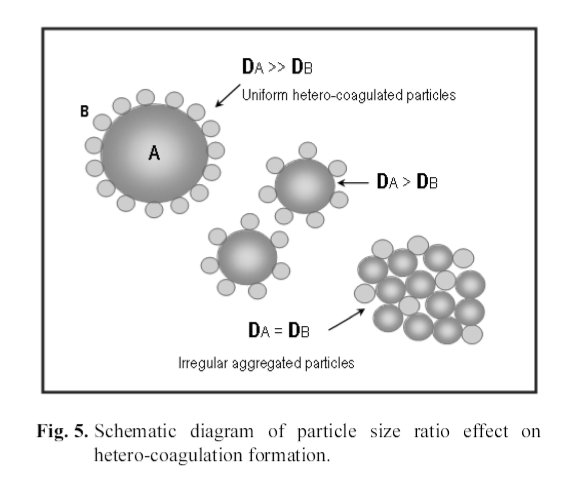 Fig. 5에 powder size에 따른 hetero-coagulation 의 발생 정도를 개략적으로 도식하였다. 문헌에 따르면 hetero-coagulation은 particles concentration, relative surface charge, relative particle size 등의 변수들에 의해 크게 영 향을 받는 것으로 알려져 있다.