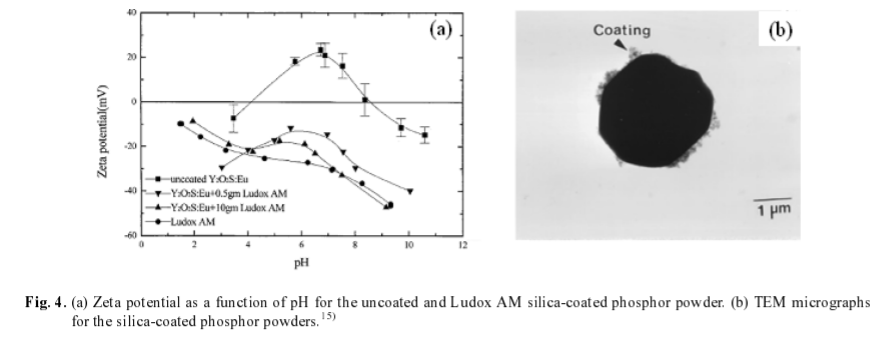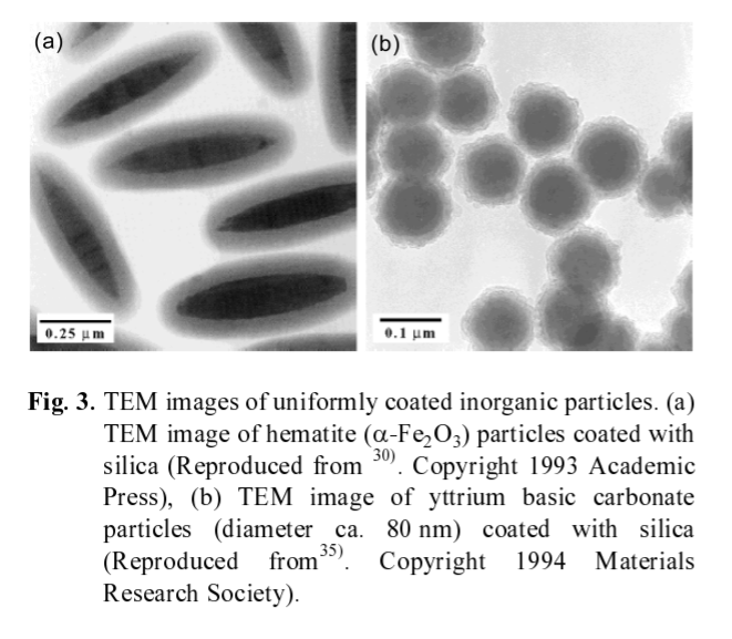 이렇게 SiO2가 coating된 hematite나 yttrium particle의 표면특성은 pure한 SiO2의 특성과 유사하게 바뀌게 되며 SiO2 coating에 의해 yttrium core particle의 dissolution이 억제되는 효과를 얻을 수 있다. 실험변수에 따라 coating layer의 두께는 달라질 수 있으며, 중요한 실험변수로는 core particle의 size, 용매 내 core particle의 농도와 alkoxide, organic solvent, water 등 reactants의 상대적인 비 등이 보고 되고 있으므로 이들을 고려한 최적 coating 조건 설정 실험 이 이루어져야 한다.