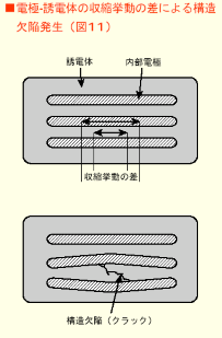 적층타입의 세라믹 콘덴서는 유전체재료와 전극이 교차로 적층되어진 상태로 소성을 하였다. 이 소성 과정에 대해서 유전체와 전극 사이에는 수축거동의 차가 발생한다. 이 수축차가 크면 그림 11에 보여준 콘덴서 내부에서 인장이나 압축 등의 응력에 의해 내부스트레스가 발생하여 크랙같은 구조결함유발의 원인이 된다. 특히 박층, 다층이 될수록 전극이 차지하는 비율이 많기 때문에 더 스트레스가 크게 되어 크랙발생에 연결된다. 크랙은 고온 부하 수명등의 신뢰성에 악영향을 미치거나 기계적 강도의 저하를 유발한다.
