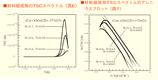 어떠한 조성에서도 tanδ에 피크가 보이고 이 피크는 고온이 되면 고주파측으로 이동한다. 또 tanδ의 피크의 크기는 Sr, Ti양이 많으면 크게 되는 것도 알 수 있다. tanδ의 피크주파수의 Arrhenius Plot에서 얻은 완화시간의 활성화 에너지는 Sr, Ti양에 영향받지 않고 0.9eV라는 수치가 얻어진다. 또한 유전 분극의 원인이 되는 전기분극의 거동을 알아보기 위해 TSC(열자격 전류)를 측정하였다.(그림6) , Sr, Ti양이 많을 수록 피크 전류가 크고, 분극밀도가 높은 것을 알 수 있다. 그림 7에서 나타낸 것처럼 TSC스펙트럼에서 얻어진 활성화 에너지는 Sr, Ti양에 영향받지 않고 0.9eV로 되어 앞에서 설명한 것처럼 손실의 완화시간의 활성화 에너지는 거의 같으므로, 저주파 유전 분극의 원인은 TSC에서 관측된 분극기구는 도일한 것으로 생각된다.