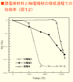 그림 12에 2종류의 Ni전극재로 유전체의 소성과정에 있어서 수축율을 나타냈다. 그림중에 Ni전극A는 특히 아무런 대책도 하지 않은 Ni의 전극체이다. 수축이 400-700℃사이에 급속하게 일어나는것을 알수 있다. 700℃근처의 온도는 재료의 탈바인더가 충분하게, 또 소성반응도 시작하지 않기 대문에 재료의 보형력이 제일 약한 온도영역으로 되어 있다. 이때 Ni전극 A와 같이 급한 수축이 일어나면 구조결함을 일으키는 원인으로 된다.