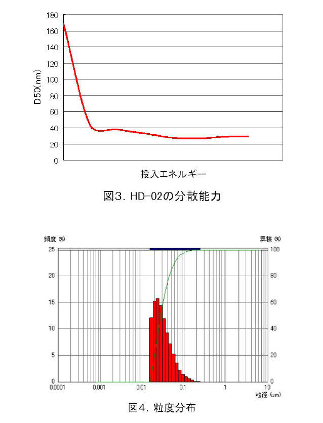 이번에 소개하고 있는 초미립자용 분산제는 분체와 용매의 슬러리에 첨가해 사용할 수 있으며, 이 슬러리를 분산기에 제공함으로써 미립자화, 분산을 한다.첨가량은 목표로 하는 입경이나 성능, 후공정에 미치는 영향에 의해 고려할 필요가 있으며, 이번에 나타낸 데이터는 모두 최적의 분산제량을 첨가해서 검토한 결과이다.또한 분산효과는 분산제의 종류, 양뿐만 아니라 사용하는 분산기에 따라서도 크게 영향을 받는 것으로 알려져 있다.