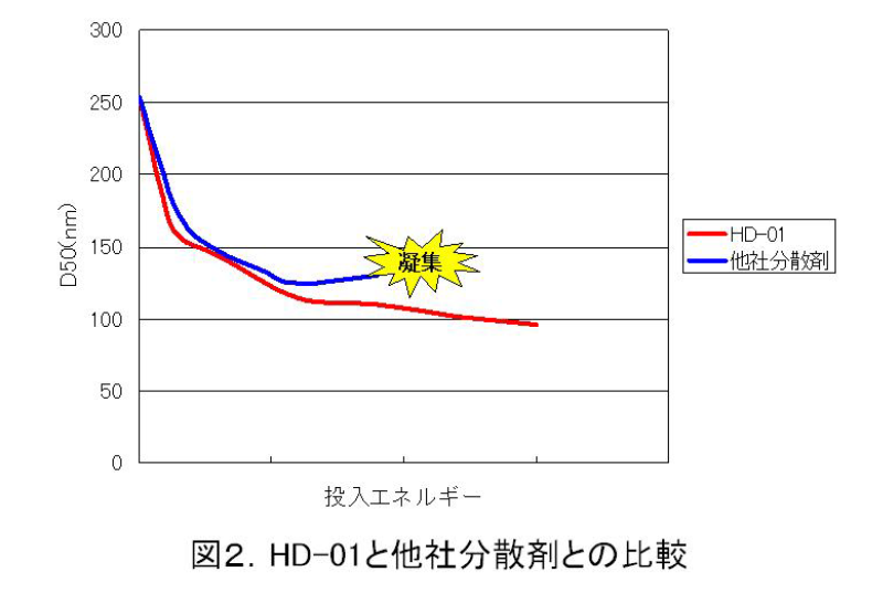 그림2는 1차 입자 지름이 미크론오더인 세라믹 입자에 대해 HD-01 및 타사 분산제를 사용하고, 비즈밀로 분쇄와 초미립자 분산을 동시에 실시한 예를 나타낸다.분산기의 투입에너지를 가로축으로 하여 평균 입경(D50, 이하 본문 안에 나타낸 입자 지름은 이 값을 표기함)을 세로축으로 하여 분산기에 제공했을 때의 입자 지름 추이를 나타냈다. 타사 분산제를 사용한 경우에는 120nm 가까이 분산된 후 입자가 응집되어 침강이 발생했다. 반면에 당사 개발 분산제 HD01을 사용했을 경우에는 최종적으로 100 nm의 분산액을 얻을 수 있었다.이것은 흡착능이 높은 설계에 의해 입자를 재빠르게 피복함으로써 재응집을 방지한 결과이다.또한 약간이지만 HD-01을 사용하면 보다 적은 투입 에너지로 소경화되고 있는 것을 볼 수 있으며, 이러한 능력도 분산제 기능의 하나라고 생각된다.