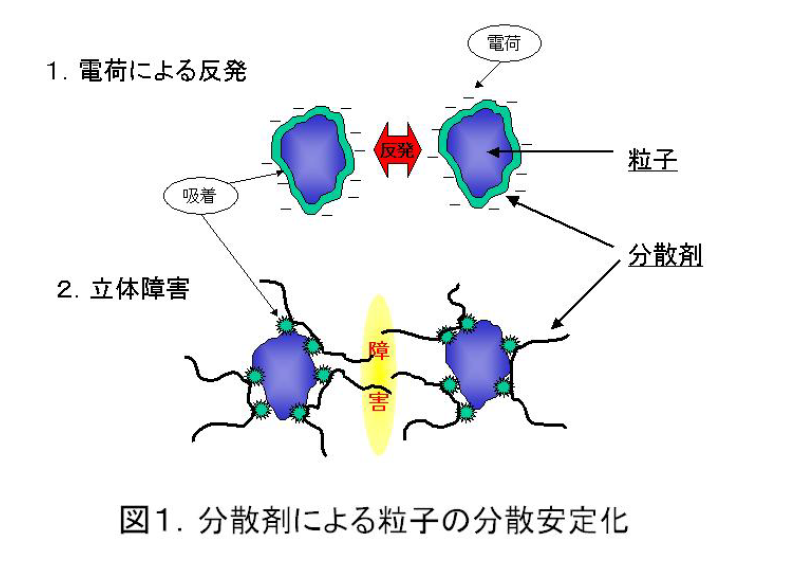 그러나 이러한 분산기를 사용하는 것만으로는 초미립자 분산이 어렵다. 이는 입자 지름이 작아짐에 따라 비 표면적의 증대와 특히 분쇄하는 경우에는 입자의 파쇄면이 고활성화됨으로써 재응집 경향이 높아지기 때문이라고 생각된다. 여기서 분산제가 중요한 역할을 하지만 기존의 분산제에서는 충분한 성능을 발휘하지 못하는 경우가 있다. 그림 1과 같이 분산제의 기본 성능은 입자 표면에 흡착하는 것과 전하나 입체 장애를 갖게 함으로써 입자 간의 재응집을 막는 것인데, 대상 입자가 너무 작기 때문에 흡착이 잘 되지 않고, 입체 장애기가 충분히 기능하지 않으며, 흡착 능력이 너무 높은 등 분산제와의 매칭이 바뀌는 것에 기인한다고 생각된다.