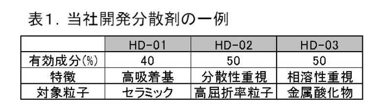 이상과 같이 초미립자 분산에서 양호한 결과를 얻기 위해서는 적합한 분산제를 선정하는 것이 중요하다.그 사실을 바탕으로 당사는 분산 기능, 바인더 수지에 대한 상용성에 특징 있는 분산제와 함께 그것들을 높은 차기로 밸런스 시킨 분산제를 개발하고 있다. 더욱이 당사에서는 분산제뿐만 아니라 분산액 및 분산기술의 개발도 진행하고 있어 고객의 요망에 따른 다양한 입자, 용도에 대한 대응을 추구하고 있다.
