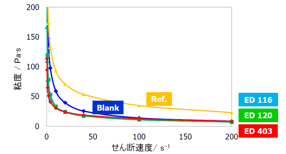 - 페이스트의 경시점도 변화: 분산제에 의해 장기간의 응집을 억제하고 점도안정성이 향상