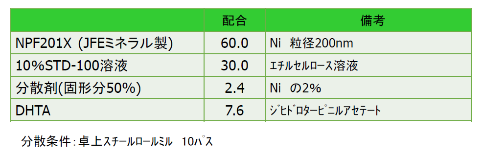 - NI-paste의 유동곡선: 분산제를 사용하여 점도가 저하하고 작업성이 향상됨