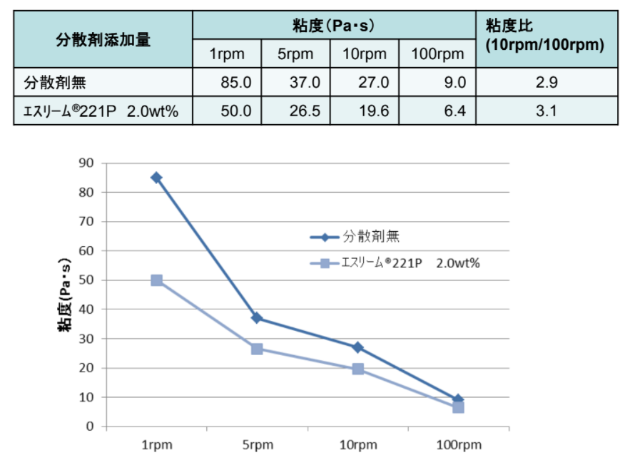 에슬림®221P의 권장 첨가량은 분체 중량에 대해 1~5wt%입니다.최적의 첨가량은 분체의 입경 · 비 표면적 등에 크게 의존하므로 다른 첨가량으로 시험을 실시하여 최적의 첨가량을 확인하도록 권장합니다.