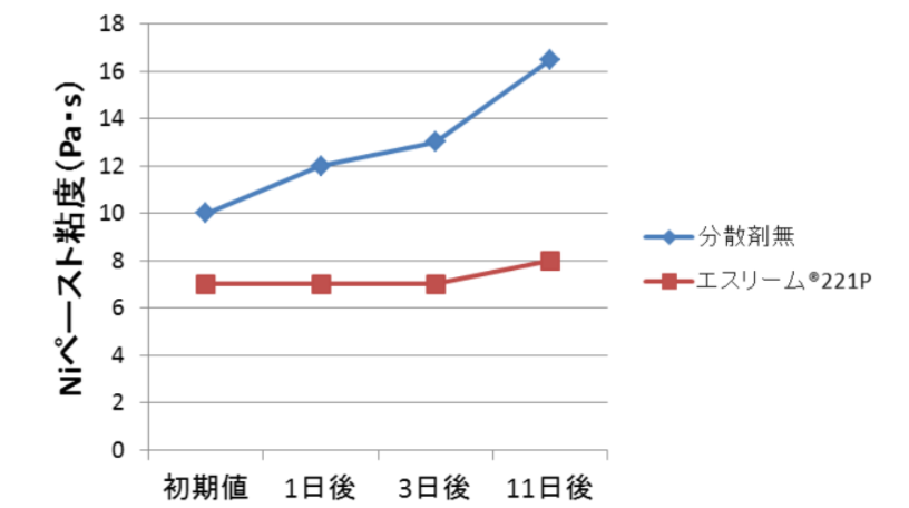 에슬림® 221P를 사용한 Ni페이스트는 시간이 경과해도 점도 상승은 보이지 않았습니다.