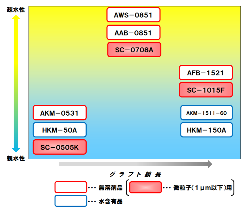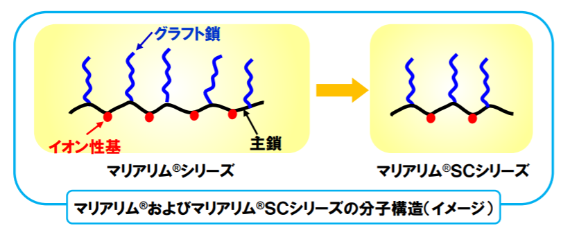 또한 마리아림®SC시리즈는 주쇄의 길이를 기존의 마리아림®시리즈보다 짧게 하며 특히 미립자(1μm 이하)에 비해 우수한 분산성을 보입니다.