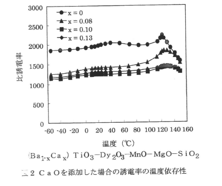 BaTiO3의 큐리점은 약 120℃ 이며 그 이상 온도에서는 급격히 유전율이 내려간다. 또 첨가하는 원소에 따라 BaTiO3 유전율의 온도 의존성은 변화하는 것이 알려져 있다. 그림1에 CaO를 첨가한 경우의 BaTiO3유전체의 온도의존성을 나타내었다.