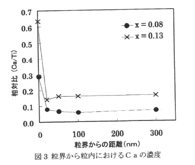 CaO는 입내에도 분포하고 있으며 농도가 첨가량에 따라 변화하는 것을 알수있다. 또 입계에서의 Ca농도는 입내에서의 농도보다 높다. 한편 그림4에 나타내었듯이 CaO를 첨가함으로써 BaTiO3 격자체적이 작아지는 것을 알수있으며, CaO를 첨가함으로써 입내와 입계의 격자체적이 수축하나 이 수축의 정도가 입내와 입계에서 다르므로 입계가 입내에 미치는 응력의 크기가 변화한다고 생각된다. 이것이 큐리온도가 유전율 피크의 브로드화 및 큐리점 이상의 온도영역에서의 유전율 저하의 한 요인으로 추정된다