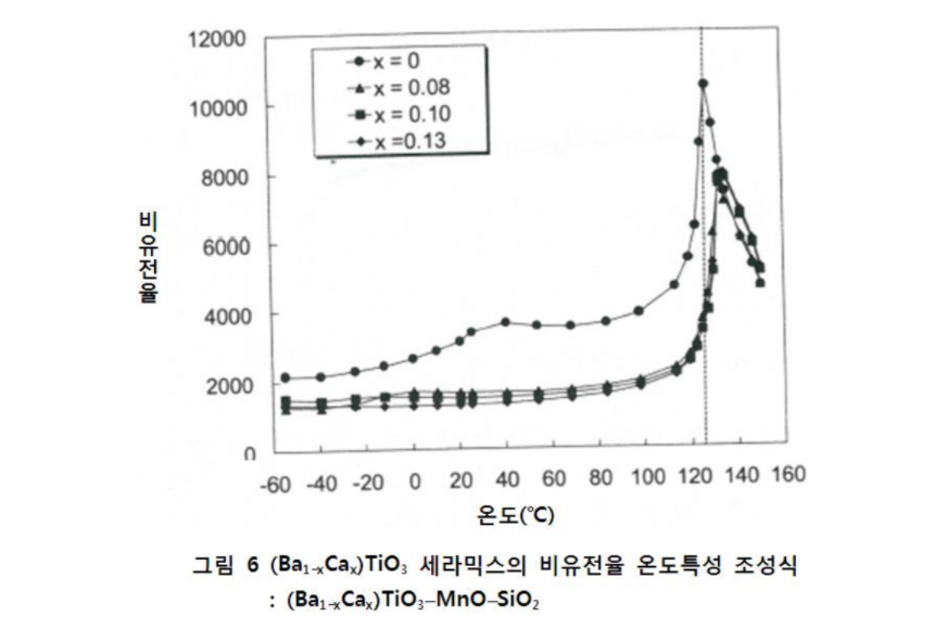 티탄산바륨은 125°C부근에 상유전=강유전 상전이가 존재하며, 상유전상 영역에서는, 급격하게 유전율이 저하된다. 이 상전이온도(큐리점)를 고온화할 수 있으면, 보다 온도 특성이 뛰어난 유전체재료의 실현이 가능해진다. 그림 6 은 CaO 을 첨가했을 경우의 티탄산바륨 유전율의 온도의존성을 나타낸 것이다. CaO 첨가에 의해 온도의존성 피크가 브로드화되어, 큐리점이 상승하는 것을 알 수 있다. 이 샘플의 조성은 순수한 티탄산바륨이 아닌, 내환원성 부여를 위한 MnO 및 소결조제로서 작용하는 SiO2 을 첨가한 조성에다가 CaO 을 첨가한 것이다.