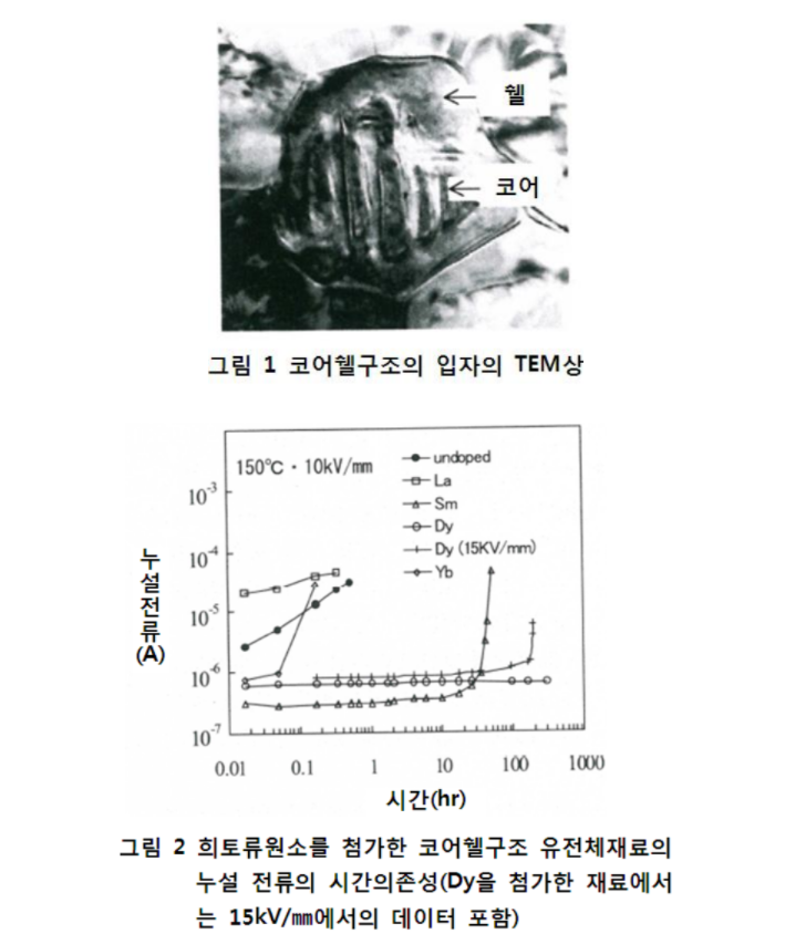 유전체 재료에는 코어쉘 구조를 갖는 티탄산바륨계 재료가 사용되고 있다. 그림 1 과 같이 코어쉘 구조란 하나의 입자 내에서 강유전성을 나타내는 티탄산바륨 코어상과, 여기에 희토류 원소 등이 확산된 쉘상이 하나의 결정입내에 공존하고 있는 구조를 말한다. 희토류 원소는 코어상과 쉘상의 체적비를 조정하여 유전율의 온도의존성을 평탄화한다. 코어쉘 구조를 갖는 유전체재료는, 고신뢰성 재료이기도 하다 고온, 고전계 하에서의 절연저항의 열화는, 유전체재료의 결정격자 속에 존재하는 산소공공(void)이 고온, 고전계에 의해 이동하여, 전하의 치우침과 입계 전위장벽의 저하를 초래함으로써 일어나는 것으로 알려져 있다.