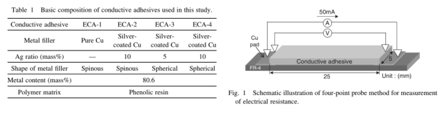 전기 전도성 접착제(ECA)는 일반적으로 전도성 금속 충전재와 고분자 수지로 구성된다. 금속 충전재의 경우, 높은 전기 및 열 전도성과 화학적 안정성 때문에 은이 가장 일반적으로 사용된다. 최근에 구리는 저저항, 저비용 및 양호한 전자 이동 성능으로 전도성 충전재 금속의 유망한 후보가 될 수 있다.