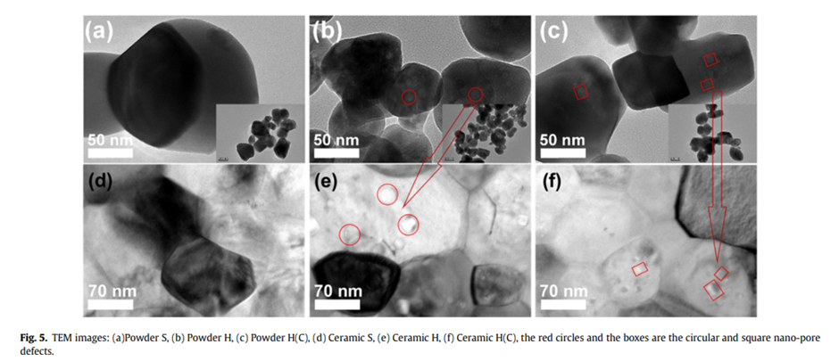 수열합성 공정에서 높은 수압 하에서 용해-재흡수 반응 중 많은 수의 결함이 BaTiO3 격자에 형성되었다. 열처리를 하면 수분과 함께 결함이 방출되고 나노미터 크기의 작은입자간 공극이 남아 모이게 되는데, 이는 소결 과정에서 더 많이 이동하게 된다. 게다가, 이 포어들은 분말 밀도를 낮추고 페로브스카이트 Unit cell의 정방정 변형을 억제할 것이다.