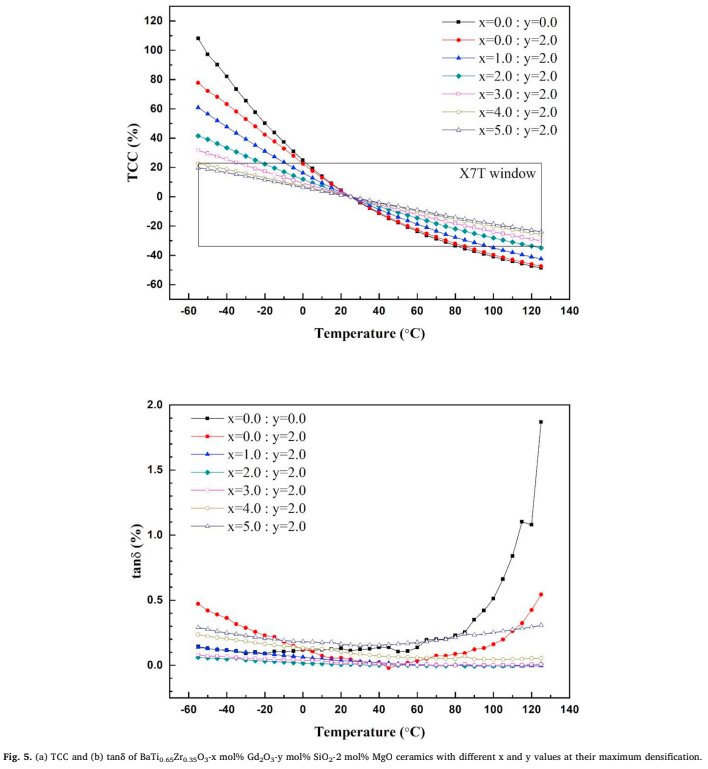 TCC(정전용량의 온도 계수)는 온도증가에 반대로 선형적인 관계를 나타내며 낸다. Gd2O3 및 SiO2 함량이 증가함에 따라 시계 반대 방향으로 회전시킵니다. BaTi0.65Zr0.35O3-2 몰% MgO-2 mol% SiO2 세라믹은 실온에서 871의 유전 상수를 가졌다. 이는 5mol% Gd2O3에 대해 417로 감소했다. 2 mol% SiO2 첨가제를 포함하거나 포함하지 않는 BaTi0.65Zr0.35O3-2 mol% MgO 세라믹스의 유전 상수는 2.5 KV/mm의 바이어스하에서 10.2% 꾸준히 감소하였다. 유전 상수의 변화 크기는 5 mol% Gd2O3 첨가제에 대해 1.33%로 상당히 감소하였다.