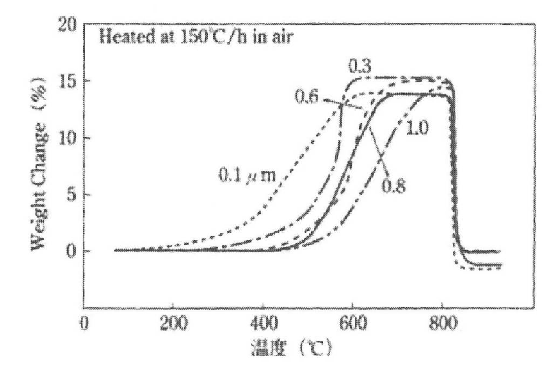 800도 이하에서 산화에 의한 중량증가가 일어난다는 것을 알 수 있다. 분말의 입경이 작을수록 산화는 저온으로부터 시작되어, 입경이 클 경우에는 고온측으로 시프트 하고 있다. 모든 경우에 약 810C에서 단번에 중량감소가 일어나 환원하여 산소를 방출함을 알 수 있다. Pd의 산화 환원에 수반하는 균열 혹은 딜러미네이션이 발생하기 쉬웠다는 것이다. 귀금속이기 때문에 공기 중에서 소성할 수 있다는 생각에서 승온시의 분위기나 속도 등에 배려가 결여되어 있었기 때문이다.