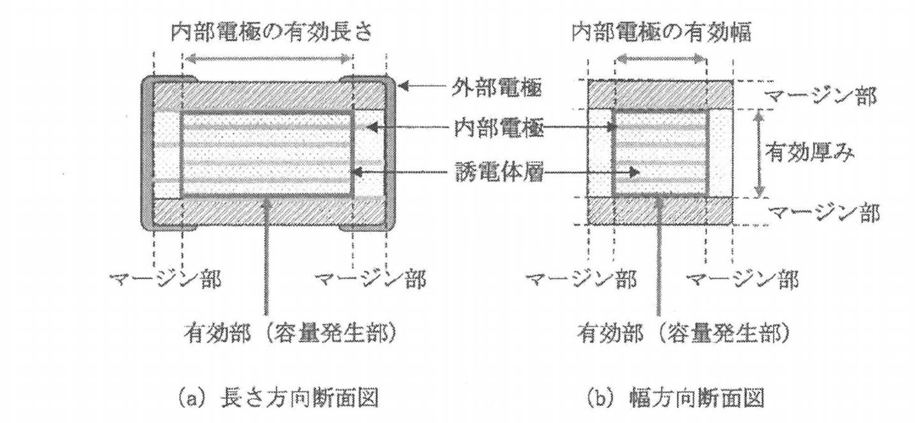 정전용량을 발현하고 있는 것은 유효부이다. MLCC는 형식에 따라 외형치수가 기정되어 있기 때문에 내부전극층의 두께tE가 같으면 유효부의 부피V를 크게 할수록 고용량화가 용이해진다.즉, 구조면에서 고용량화를 도모하려면 유효부 이외의 외부전극, 마진부를 최대한 작게 하고, 내부전극의 유효면적 A를 크게 하는 것이 요구된다.