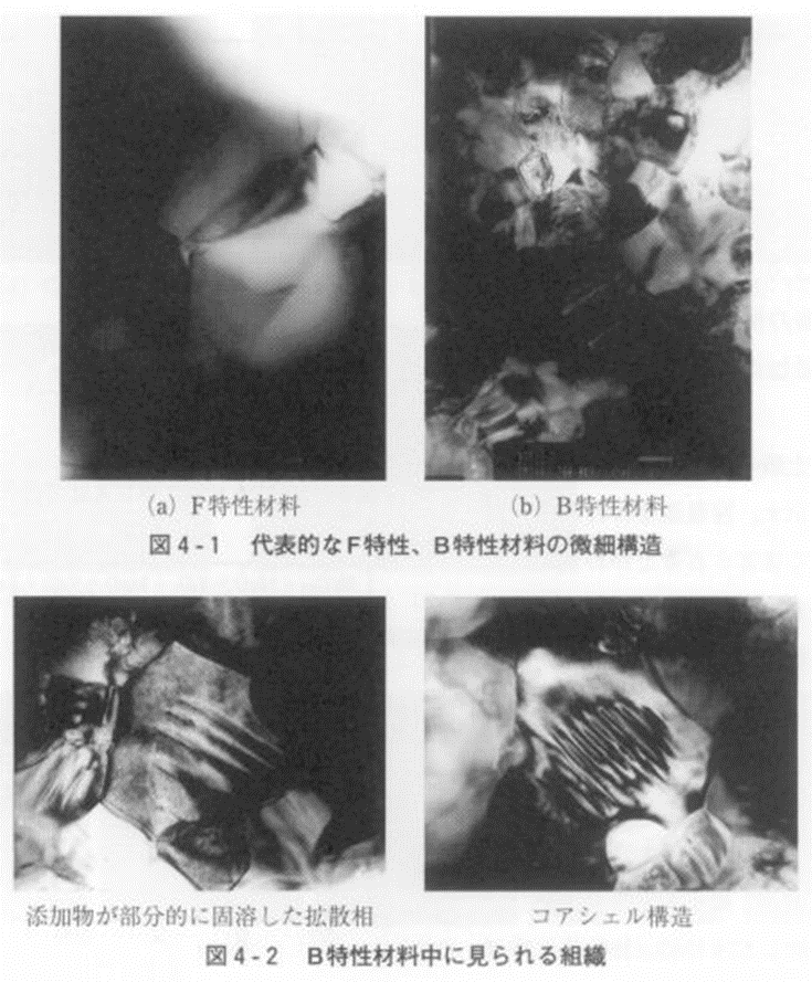F특성 재료는 주조성과 첨가물성분을 고용시키기 때문에 결정입경은 비교적 크고 (약1~2㎛), 결정내부의 조직은 균일한 것을 알 수 있다. 한편 B특성 재료는 결정입경이 미세하고(1㎛이하), 첨가물이 부분적으로 고용한 불균일한 구조를 취하고 있는 것을 알 수있다. 이런 종류의 대표적인 것으로서 core shell구조라 불리는 구조가 있다. 이 구조는 BT를 핵으로 하여, 외부에 첨가물이 고용하고, 삶은 달걀같은 2중 구조이다. 이런 종류의 구조는 온도평탄화에 중요하지만, 실제의 조성물에서는 이같은 2중 구조는 적고, 통상, 부분적으로 첨가물이 확산한 것 같은 불균일한 결정입자가 많이 관찰된다. 이같은 B특성 재료로는 첨가물조성과 미세구조의 양쪽의 영향이 온도특성에 관계깊다.