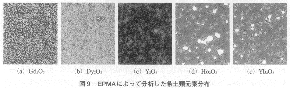 그림 9에 이온반경이 다른 희토류(Gd, Dy, Y, Ho, Yb)를 첨가한 시료의 EPMA원소 mapping 결과를 나타내었다. 결정 입성장이 확인된 Gd첨가시료의 Gd원소의 분포가 균일한 것으로부터 희토류의 고용에 의해서 입성장이 진행한다고 생각된다. 한편, Dy, Y를 첨가한 경우, 희토류가 약간편석하는 경향이 있다. TEM에 의한 미세구조의 관찰결과 (그림10), core shell구조와 부분적으로 첨가물이 고용하고 있는 확산상이 관찰된다.