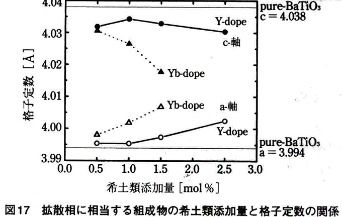 Y 및 Yb의 농도별 확산상조성물의 격자정수의 변화를 그림 17에 나타내었다. Y계 확산상의 격자정수는 Y함유량의 증가에 따라 a, c축은 완만하게 변화하는데 비해서, Yb계의 확산상의 격자정수는 급속하게 입방정으로 향해 a, c축이 변화하고 있는 것을 알 수 있다. 이 결과로부터 첨가물이 확산하지 않은 BT와 확산상의 격자정수의 부정합은 Yb의 쪽이 Y에 비해서 크다고 예상된다. 이 확산상과 BT의 격자정수의 부정합이 TEM으로 관찰된 응력간섭무늬의 발생원인이라 생각된다.