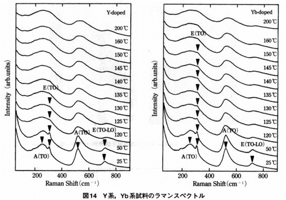이 curie온도의 고온이동의 원인을 조사하기 위해서, 그림 13에서 나타낸 XRD결과로부터 a/b비를 구해 결정이방성에 대해서 평가를 하였다. 그 결과를 표 2에 나타내었다. curie온도의 고온이동이 확인된 Tm, Yb, Lu첨가시료의 결정이방성은, Y, Dy첨가시료에 비해서 크다는 것을 알 수있다. curie온도의 고온이동과 상전이 모드의 관계를 조사하기 위해서, Yb첨가시료 (Tc=123℃)와 Y첨가시료 (Tc=119℃)에 대해서, 라만분광법에 의한 상전이거동을 해석했다. 그림 14에 시료의 온도를 변경했을 때의 라만스펙트럼을 나타냈다.