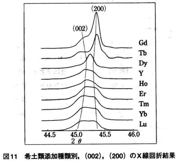 희토류 첨가에 대한 BT의 결정구조의 변화를 조사하기 위해서 XRD로부터 (200), (002)의 면간격을 측정했다. 그 결과를 그림11에 나타냈다. Dy이하의 이온반경이 작은 희토류를 첨가함에 따라 (200) (002)의 면 간격은 작아지고, peak의 분리는 불명료하게 된다. (BT의 결정이방성이 저하한다고 생각된다.) 이 Dy이하의 이온반경이 작은 희토류의 첨가에 따라서 결정이방성이 저하하는 현상은, 용량온도특성의 평탄화의 거동과 일치하고 있다. 이같은, B특성 재료에서의 온도특성의 평탄화는, BT의 결정성의 제어, 미세구조의 제어에 관련있다고 생각되고, 희토류의 첨가는 중요한 역할을 하고 있다