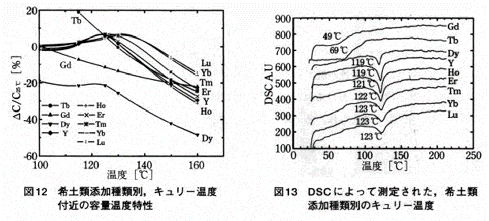 일반적으로 BT의 상전이 온도를 이동시키는 첨가물로서 Sr, Ca, Pb, Zr, Hf, Sn이 알려져 있다. 이들의 첨가물은, BT의 Ba 또는 Ti와 치환하고, 페로브스카이트 구조를 형성하는 원소군이다. 그림 3에 각원소와 BT의 Ba 또는 Ti를 치환했을 때의 curie온도, 제1상전이점, 제2상전이점의 변화를 나타내었다. Pb는 curie온도를 고온 측으로 이동시키고, 제1, 제2상전이점을 저온 측으로 이동시킨다. 특히 curie온도의 변화율은 Pb 치환량에 비례하고, 치환량에 따라서 curie온도를 임의적으로 변화시킬 수 있다. Sr은 Pb와는 반대로 첨가량에 비례해서 curie온도를 저온 측으로 이동시킬 수 있는 원소이다. 또 Ti를 치환하는 Zr, Hf, Sn은 curie온도를 저하시키지만, 제1, 제2상전이 온도를 고온 측으로 이동시키는 특징을 갖는다.