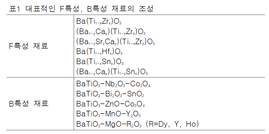 BT의 용량온도특성은 그림1과 같으며, 콘덴서로서 사용하기에는 용량의 변화율이 지나치게 크다. 그래서 일반적으로는 BT에 대하여, 각종 원소를 치환, 또는 첨가함으로써 용량온도특성을 평탄화할 수 있다. 대충 크게 나누면, 그림 2와 같이 BT의 curie온도를 저온역으로 이동시켜, 온도특성을 완화하게 하는 방법 (그림중 A)와 BT의 curie온도 부근의 유전율을 낮추어 온도 특성을 평탄화하는 방법 (그림중 B)가 있다. 전자는 사용온도 범위에서 유전율을 높이는 것이 가능하여 F특성 재료의 개발로 사용한다. 후자는 용량온도 변화율을 전자에 비해서 작게 하는 것이 가능하여 B특성 재료로 사용한다. 표 1에 F특성 및 B특성재료에 사용되는 대표적인 재료조성을 나타내었다.