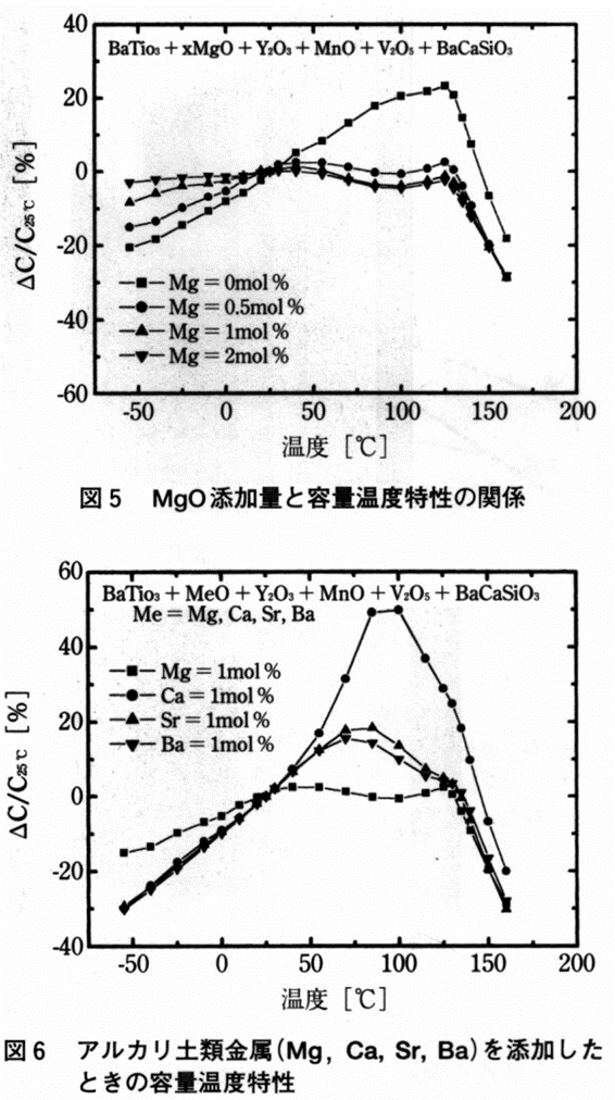 또 B특성 재료에 있는 첨가물조성과 미세구조, 용량온도 특성의 관계에 대해서 서술하겠다. 앞서 언급했듯이, Ni내부전극용 B특성재료에는, 주로 Mg-희토류 계의 조성이 사용되고 있다. Mg는 BT에 내환원성을 부여함과 동시에 BT의 온도특성을 평탄화시키는 효과를 가진다. 또 희토류는, 고온가속 수명의 신뢰성개선과 동시에 용량온도특성의 평탄화에 기여한다. 온도특성 및 미세구조는 Mg와 희토류의 첨가량에 크게 영향을 받는다. 그림5에 Mg 첨가량에 의한 용량온도특성을 나타내었다. Mg 첨가량이 증가함에 따라서 curie온도 부근의 유전율감소와 저온영역의 유전율증가에 의해 온도특성이 평탄화해 간다는 것을 알 수있다. 또, Mg와 같은 효과가 기대되는 Ba, Ca등의 알칼리 토류 금속의 첨가효과에 대해서도 확인한 결과를 그림 6에 나타낸다. 이 실험결과에서 용량온도특성의 평탄화는 Ba, Ca등의 사용에 의해서도 가능하지만, Mg첨가가 특히 우수하다는 것을 알 수있다.