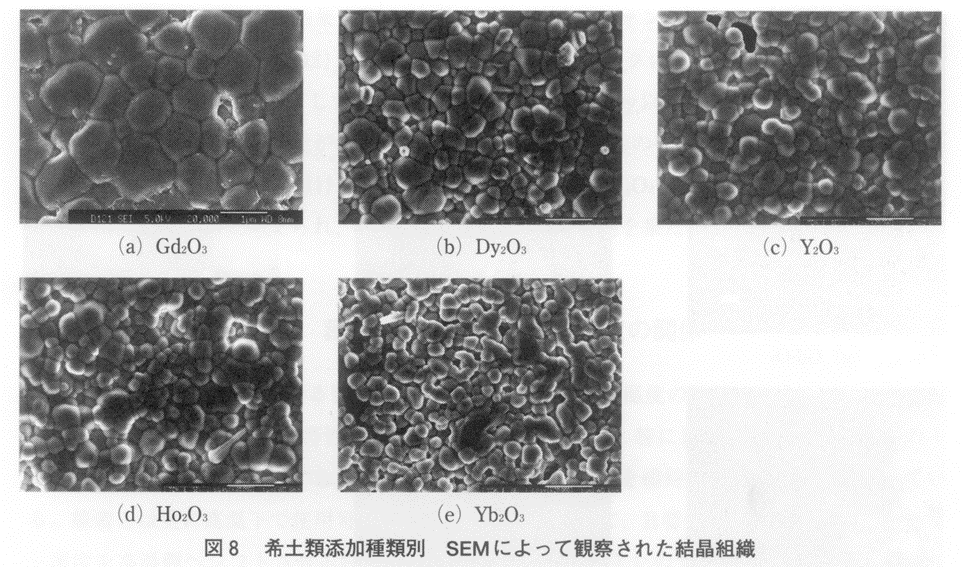 한편 이온반경이 작은 희토류를 첨가한 경우는 온도특성이 평탄화되고 있다. Dy 이하의 이온반경이 작은 희토류를 첨가한 경우, 소위 X7R특성, B특성으로 불리는 온도특성을 만족시켜 가고 있다. 이 희토류의 종류에 따른 온도특성의 변화는 미세구조의 변화와 관련있다는 것을 알 수 있다. 그림 8에 희토류 종류 (Gd, Dy, Y, Ho, Yb)를 변화시킬 때의 미세구조의 변화를 나타내었다. 용량온도특성의 변화율이 큰 Gd를 첨가한 시료의 결정입경은 크고, 용량온도 변화율이 작은 시료 (Dy, Ho, Y, Yb)에서는 결정입경이 작다는 것을 알 수 있다.
