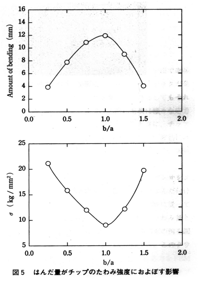 휨강도에 의해 소지내부가 파괴되므로 칩의 소지강도가 당연히 휨강도에 영향을 미친다고 할 수 있다. 칩의 소지강도와 휨강도의 관계를 그림 11에 나타내었다. 항절강도가 향상함에 따라 휨강도가 향상되는 것을 알 수 있다. 휨강도 시험 시에 칩에 생기는 응력은 9kg/mm2정도인 것으로 예상되며 chip소지는 그 이상의 강을 필요가 있다.