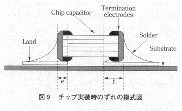 그림9에 나타낸 방법으로 양 단자전극의 표면에서 기판의 land단까지의 길이를 각각 취해, 긴 값을 f, 짧은 값을 e라고 한 경우, f-e에서 얻은 값을 land차라고 하였다 이 결과를 그림 10에 나타내었다.