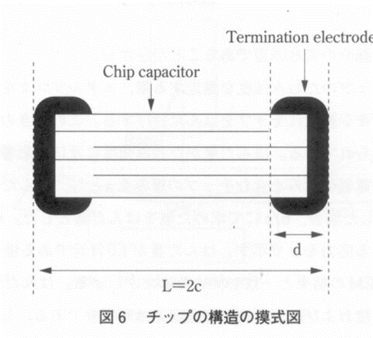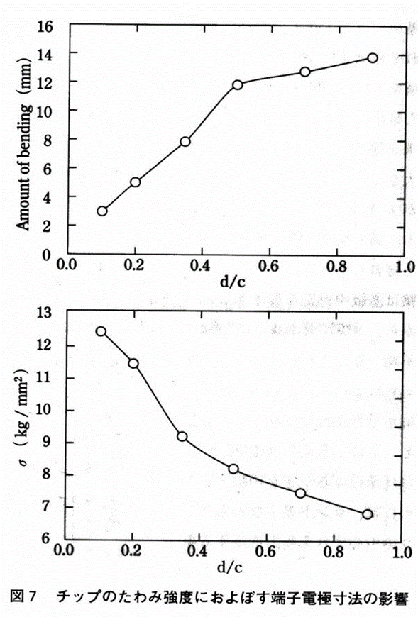 단자전극은 통상 페이스트를 도포하여 형성하는데, 칩 치수나 재질에 따라 단자전극 형상이 변경되는 수가 있다. 단자전극형상과 휨강도의 관계에 대해서 서술하겠다. 그림 6에 나타낸 칩의 길이를 2c로 하고, 단자전극의 측면의 길이를 d로 한 경우, d/c에서 얻은 값을 측면전극 치수비라고 하자.