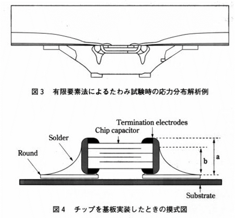 기판측에 배선된 단자전극 edge부분의 소지주변에 인장응력이 집중되어 있음을 알 수 있다. 따라서 이 포인트를 기점으로 파괴가 시작되고, 칩 내부로 크랙이 전파해 나간다. 또 여기에는 예로 나타내지 않았지만 단자전극 edge부분의 소지부근에서 크랙이 발생하여, 칩 내부에서 멈추는 경우도 있다. 이 것에서도 크랙의 발생기점이 단자전극edge부분의 소지 주변이라는 것을 알 수 있다. 칩의 휨강도를 측정할 때 메탈마스크를 이용하여 납땜량을 일정하게 제어하고, glass epoxy기판에 칩을 납땜한다. 이 때의 납땜량은 칩 치수 등에 따라 결정된다.