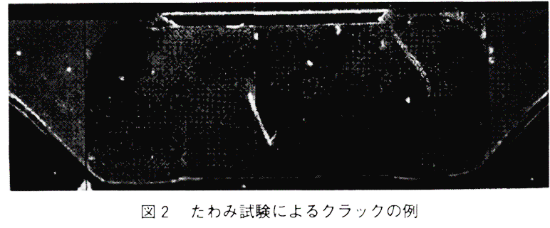 휨강도 시험후의 칩의 파괴 면의 예를 그림 2에 나타내었다. 칩에 크랙이 생기고, 내부전극이 깨져 있는 것을 알 수 있다. 이 크랙에 의해 칩의 정전용량이 저하한다.