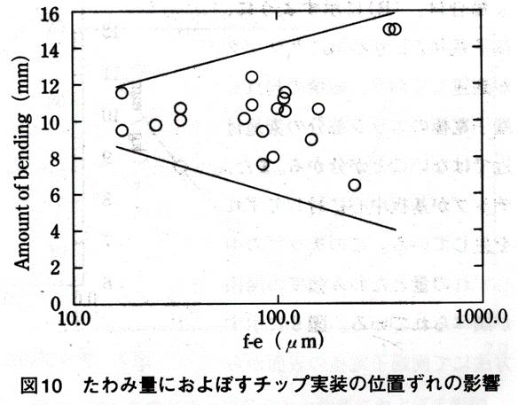 land차가 클수록 휨강도는 커지고 산포가 크다는 것을 알 수 있다. 단자전극은 land부에서 기판과 접착되어 있으며 휨강도시험은 기판중심에서 가압하므로 land부 및 chip에 불균일한 응력이 생긴다고 생각된다. 그 결과 그림8과 같이 크랙이 발생한다고 생각된다. 따라서 강도치의 산포를 제어하기 위해서는 land차 즉 칩 중심 이탈을 적극 감소시켜야 할 필요가 있다. 이상과 같이 칩의 휨강도에는 칩의 단자전극치수, 납땜 량, 기판에의 장착 상태등의 구조적 요인이 매우 큰 영향을 미치고 있다.