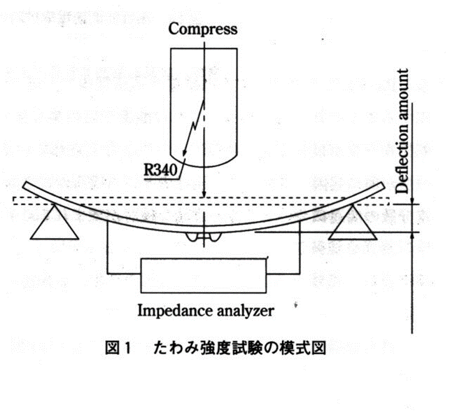 휨강도시험법을 그림 1에 나타내었다, 단자전극을 형성한 적층세라믹 콘덴서를 메탈마스크를 이용하여 납땜 량을 일정하게 제어하면서 glass epoxy기판을 사용하여 reflow로에서 납땜을 하는 것이 일반적이다. 이 기판의 뒷면에서 1mm/s의 속도로 가압하고, JIS-C6429에 따라 적층 세라믹 콘덴서의 정전용량이 -12.5% 저하했을 때의 기판의 변위 량을 휨 량으로 한다. 또 이때의 응력을 휨강도로 한다.
