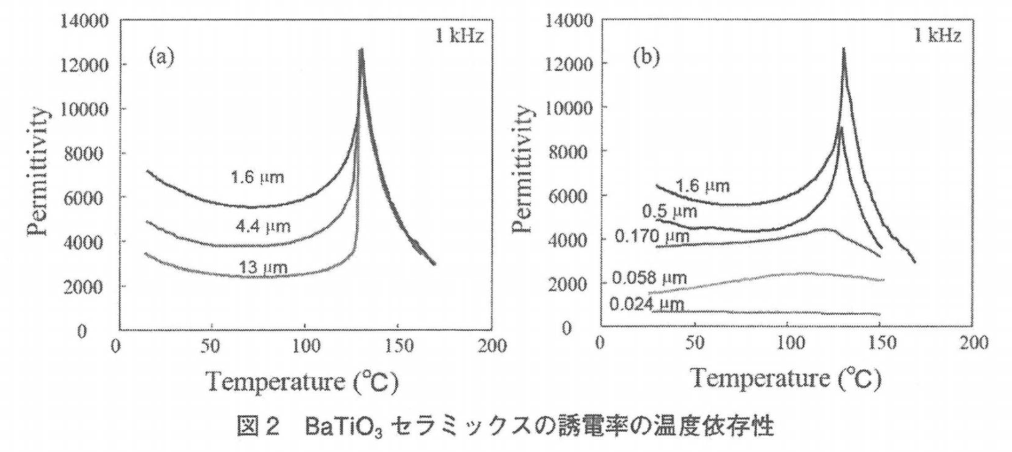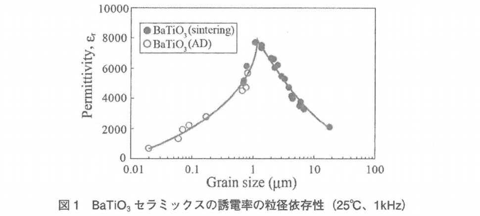 BaTiO3가 발견된 지 약 10년 후인 1954년에 Kniepkamp와 Heywang은 BaTiO3 세라믹스의 유전 특성이 그레인 크기에 의존한다고 보고하였다. 또한 1976년에 Kinoshita와 Yamaji는 BaTiO3 세라믹스의 비유전율은 입경 감소로 인해 증가하고 평균 입경 1.1um에서 약 5000에 달한다고 보고하였다. 1985년 Arlt들의 보고에서는 입경 약1um에서 비유전율을 나타낸다고 보고하였다. BaTiO3 세라믹스의 유전율은 입경 1um 부근에서 최대가 되는 현상은 현재 널리 알려져 있다.
