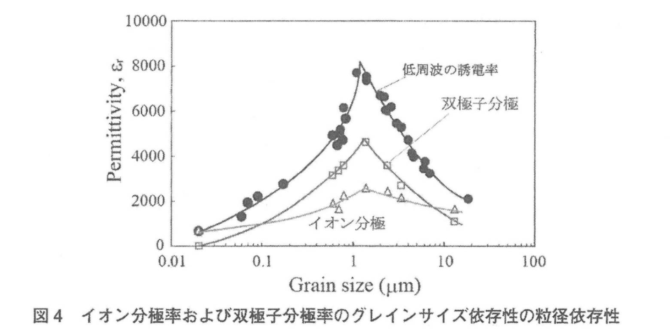 이온분극, 쌍극자분극의 입경 의존성을 나타낸 것이 그림 4이다. 입경 1um 이상에서는 입경이 감소함에 따라 쌍극자 분극, 이온 분극이 함께 증대하고 있음을 알 수 있다. 쌍극자 분극이 증가한 것은 분명히 90° 도메인 벽 밀도가 증가했기 때문이다. 또 이온분극이 증가한 것은 90°도메인벽 부근에 존재하는 격자의 왜곡된 영역의 밀도가 증가했기 때문으로 이해하고 있다. 즉, 입경 감소에 따른 유전율 증가는 도메인 구조에 의해 설명할 수 있다.
