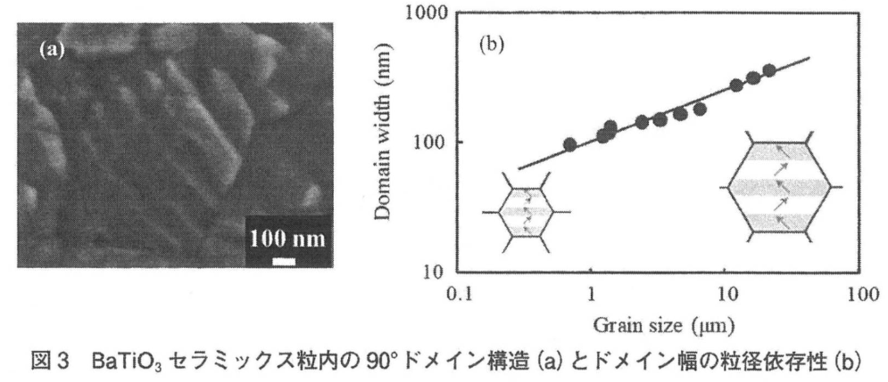입경이 약 1um 이상인 경우에 입경 감소와 함께 유전율이 증가하는 이유에 대해 설명한다. 유전율 증가는 강유전상(삼방정, 직방정 및 정방정)에서 일어나는 현상으로 입경 감소에 따른 유전율 증가가 도메인 벽의 기여와 관련되어 있음을 시사한다. 화학에칭을 한 시료 표면을 주사형 전자현미경으로 관찰한 결과, 그림3(a)와 같은 층상의 90°도메인을 확인할 수 있었다. 또한 90°도메인의 폭은 입경이 감소함에 따라 감소하였다(그림3(b)). 입경과 90°도메인의 폭의 관계에 대해서는 Arlt 등이 이론적인 해석을 주고 있으며, 그것을 간단히 설명하면 다음과 같다.
